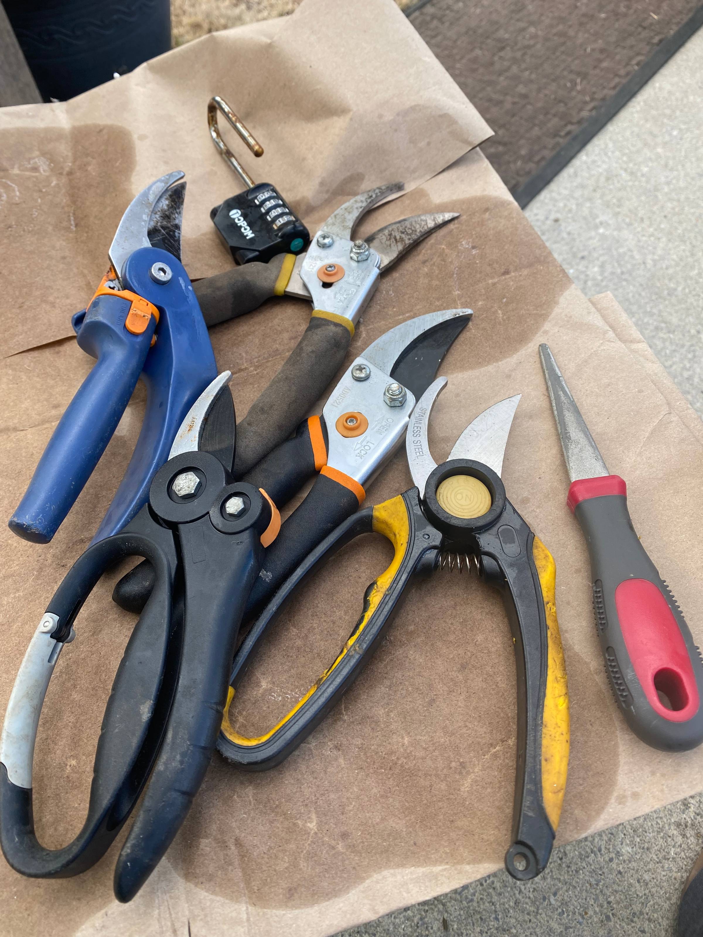 I organized my storage unit and cleaned all my secateurs (clippers) and a nearly frozen lock. A bath in soapy water, a spritz of WD40, and a good sharpening; they're ready for Spring.