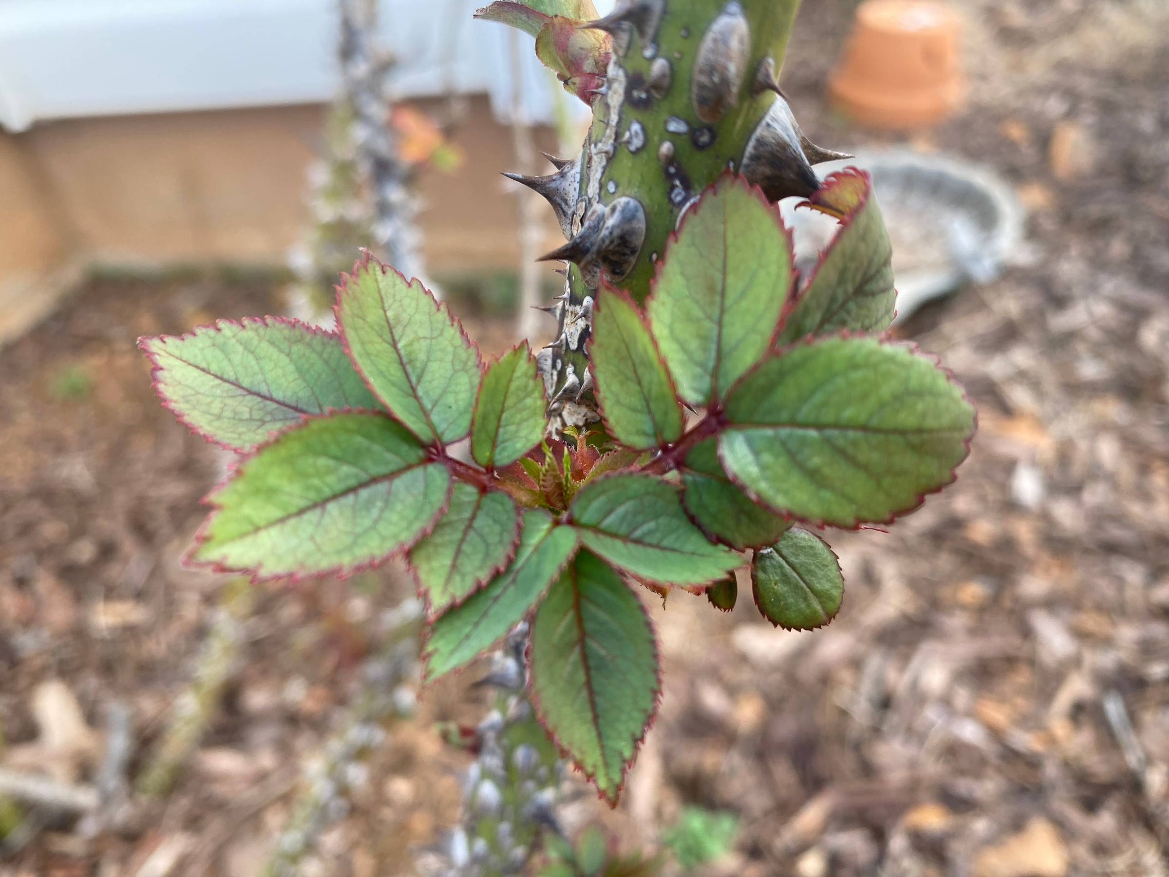 I don't typically like them because the petals drop too soon and the thorns are weapons!! I have been wounded so badly by monster thorns on this bush. This is my only rose bush left (others got rose rosette, a killer disease), and the flower is a beautiful salmon color. That's why I keep it. These little leaves remind me that there is beauty inside waiting to blossom.